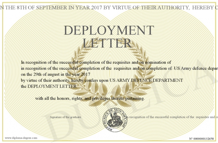 delivered to his owner by in recognition of the successful completion of the requisites and on completion of US Army defence department on the 8th of September in year 2017 by virtue of their authority, hereby confers upon levonn Lawrence the deployment letter with all the honors rights, and privilege there to pertaining !