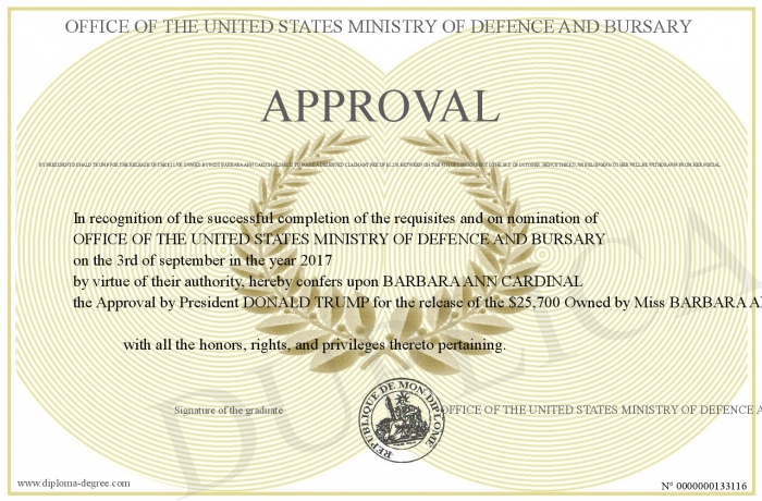 Certificate-degree can have your Approval by President DONALD TRUMP for the release of the $25,700 Owned by Miss BARBARA ANN CARDINAL,she is to make a deserved claimant fee of $1,250 between on the 4th of September to the 3rd of October, hence the $25,700 belonging to her will be withdrawn from her portal.