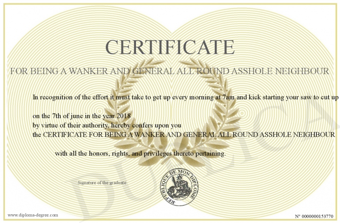 Certificate-degree can have your CERTIFICATE FOR BEING A WANKER AND GENERAL ALL ROUND ASSHOLE NEIGHBOUR