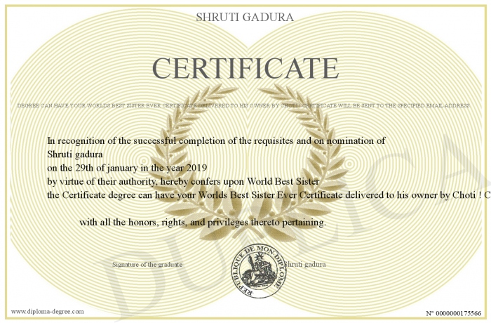 Certificate-degree can have your Certificate degree can have your Worlds Best Sister Ever Certificate delivered to his owner by Choti ! Certificate will be sent to the specified email address.