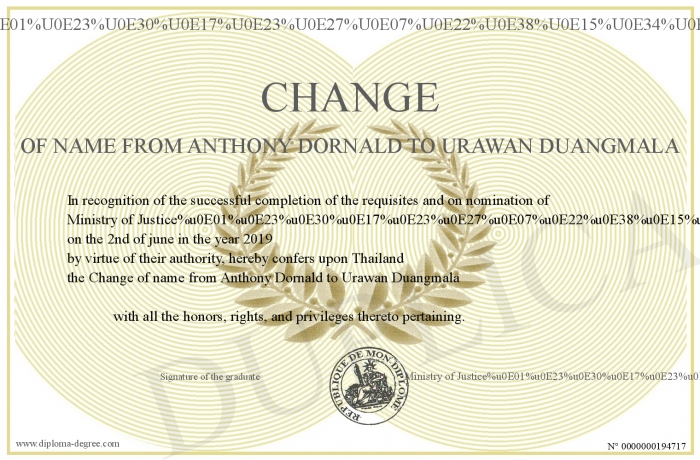 Certificate-degree can have your Change of name from Anthony Dornald to Urawan Duangmala