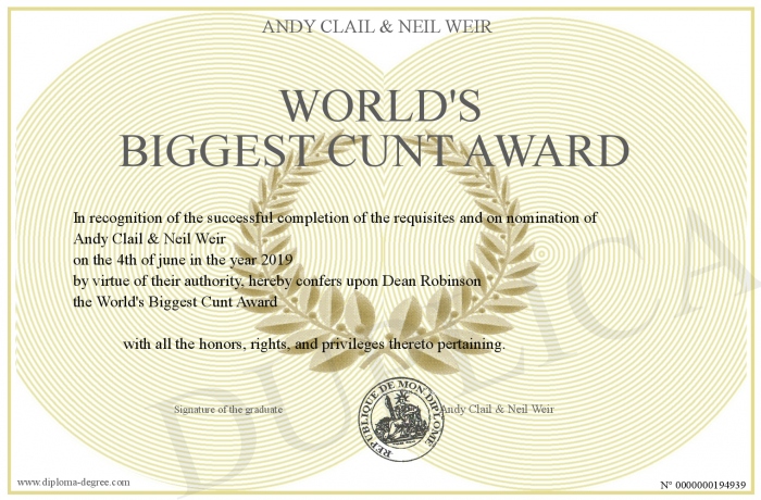 Certificate-degree can have your World's Biggest Cunt Award