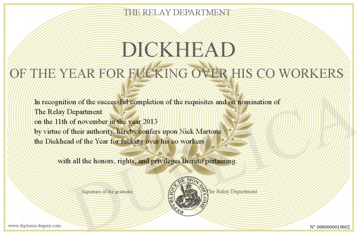 Certificate-degree can have your Dickhead of the Year for fucking over his co workers