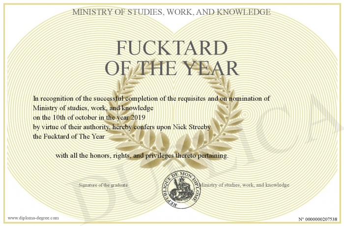 Certificate-degree can have your Fucktard of The Year