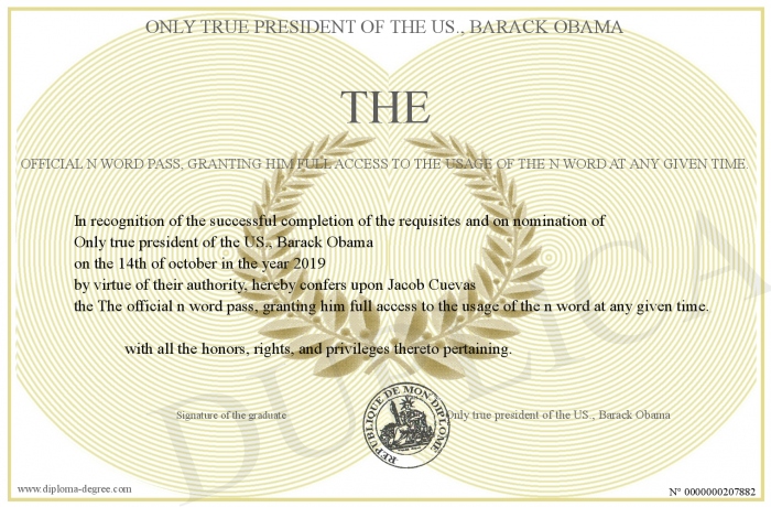 Certificate-degree can have your The official n word pass, granting him full access to the usage of the n word at any given time.