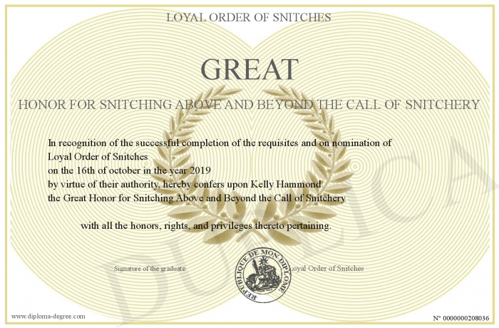 Certificate-degree can have your Great Honor for Snitching Above and Beyond the Call of Snitchery
