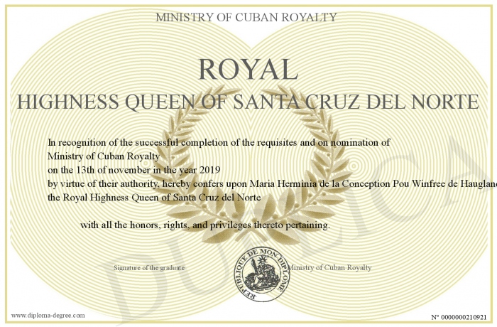 Certificate-degree can have your Royal Highness Queen of Santa Cruz del Norte