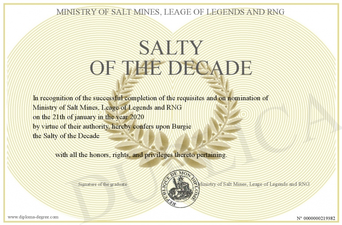 delivered to his owner by Ministry of Salt Mines, Leage of Legends and RNG !