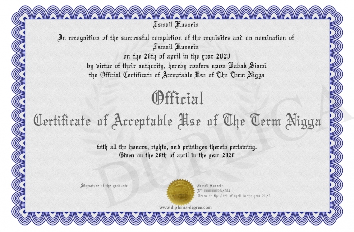 Certificate-degree can have your Official Certificate of Acceptable Use of The Term Nigga