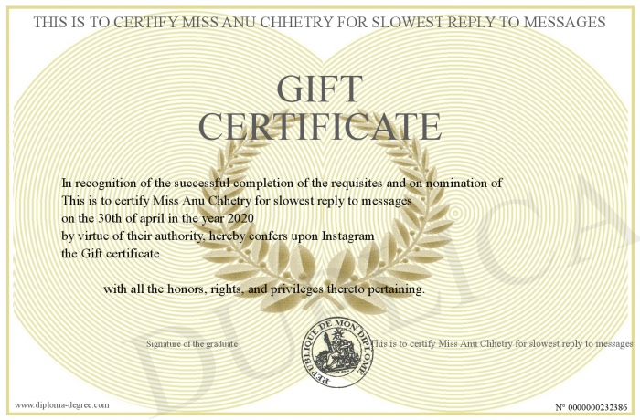 delivered to his owner by This is to certify Miss Anu Chhetry for slowest reply to messages !