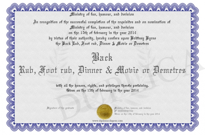 Certificate-degree can have your Back Rub, Foot rub, Dinner & Movie or Demetres