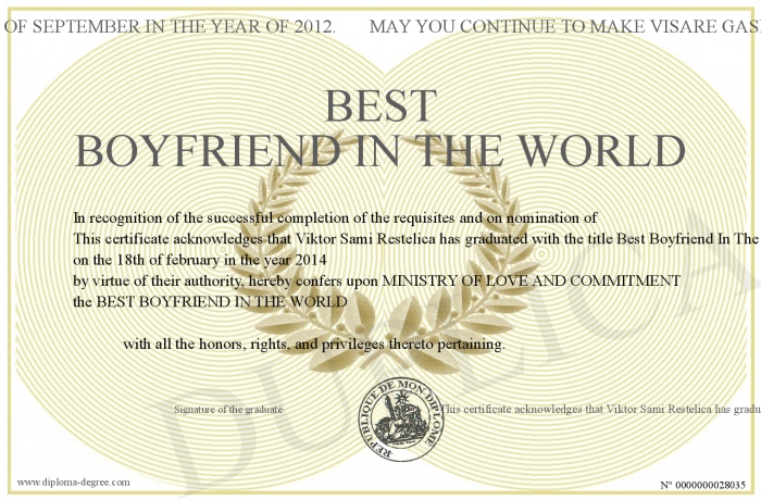 delivered to his owner by This certificate acknowledges that Viktor Sami Restelica has graduated with the title Best Boyfriend In The World since the 10th of September in the year of 2012. May you continue to make Visare Gashi feel blissfully happy and unconditionallu loved. Iam proud to issuc you this award. you are truly an inspiration to all lovers !