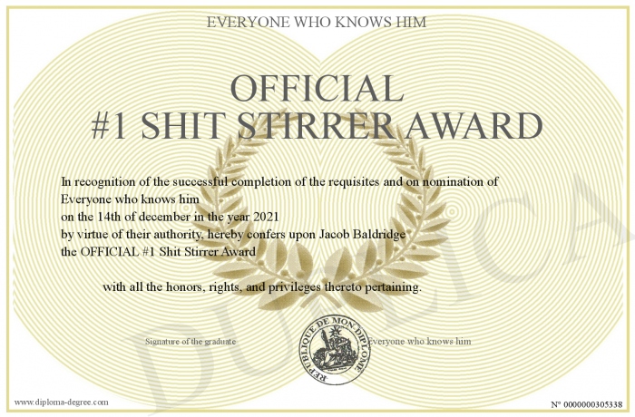 Certificate-degree can have your OFFICIAL #1 Shit Stirrer Award