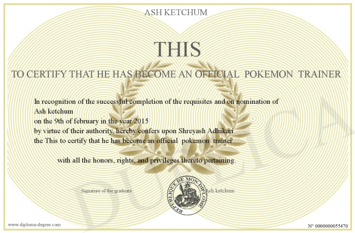 Certificate-degree can have your This to certify that he has become an official pokemon trainer