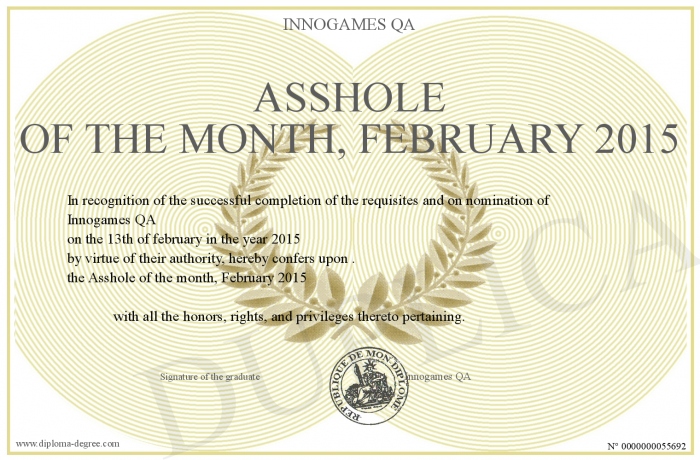 Certificate-degree can have your Asshole of the month, February 2015